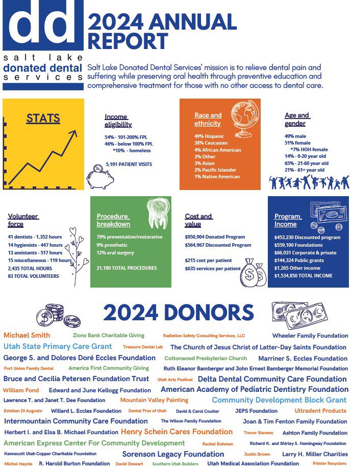 In 1990 Salt Lake City dentist, Dr. Ralph Montgomery, recognized access to oral health care for the disadvantaged within our community was nearly nonexistent. Many of the poorest and most destitute were forced to go without needed dental care. Often restorable teeth were extracted because there were simply no other options available. As a result, Dr. Montgomery founded Salt Lake Donated Dental Services (SLDDS). He believed that a healthy smile should not be limited to those with financial means and that with community commitment SLDDS’ Donated Dental Program can provide sorely needed quality dental care to Utah’s homeless and extremely low-income individuals (at or below 100% of the Federal Poverty Level) at no cost.